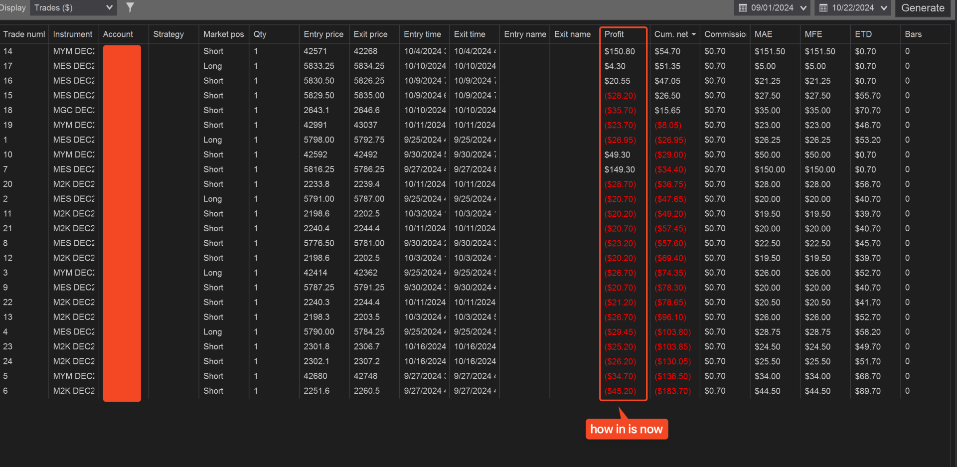Hello, I want do download my trades report to one one of the platform for statistic analise but one of the parameter showing not the way it should be,it is in profit column . If I have profit it has white color, if I had loss in has red color. Can I change it so if I have loss it shows minus in front of number of loss, not only glows red?Hope you understand what I mean.Tags: None