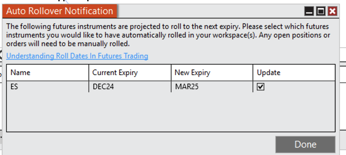 Every time I start the app I get the same warning about rolling over my ES contract. I've done it but the dialog still comes up and will not go away. All the open chart tabs have the March contract loaded. Yet it keeps asking me to rollover.