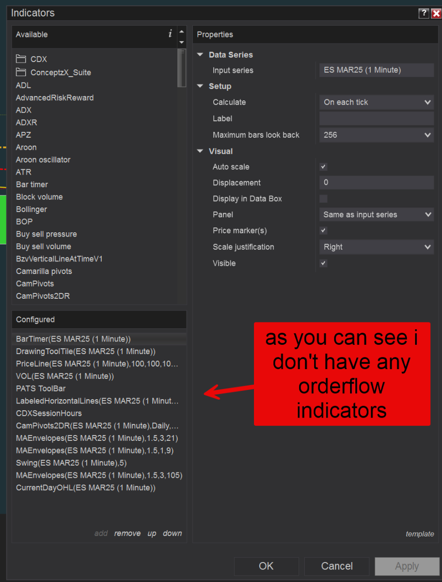 If you're not sure if your chart has an Order Flow indicator you can right click, select 'Indicators' to review.
