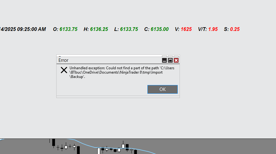 It appears this error is coming from One Drive backing up the Documents folder and preventing NinjaTrader from accessing the files it needs to move forward.