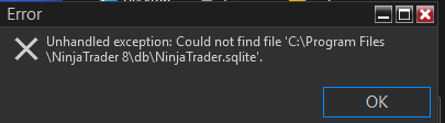 I used to be able to just delete the NinjaTrader.sqlite in C:\Users\user\Documents\NinjaTrader 8\db and it'll recreate a new database when I startup NinjaTrader again. When I do that now I get an Unhandled Exception for it but it seems to look for it in C:\Program Files\NinjaTrader 8\db.