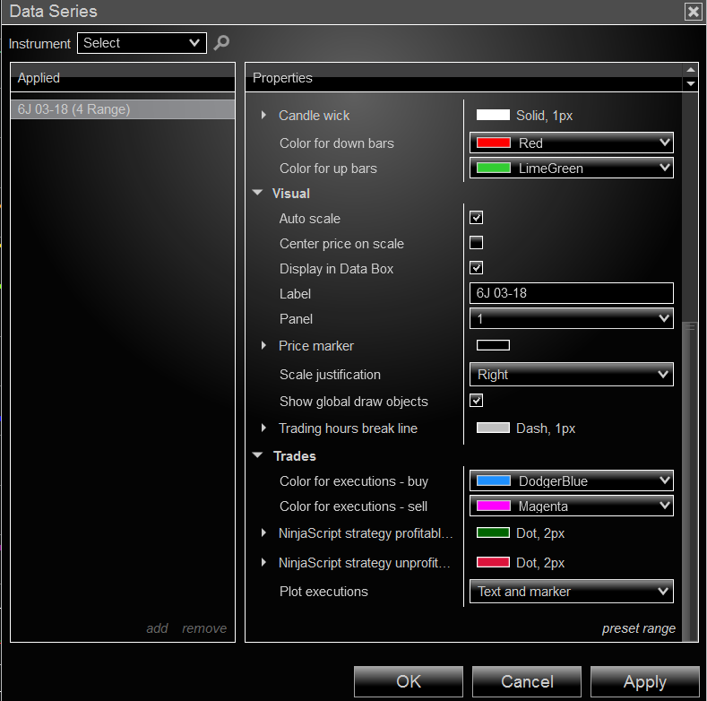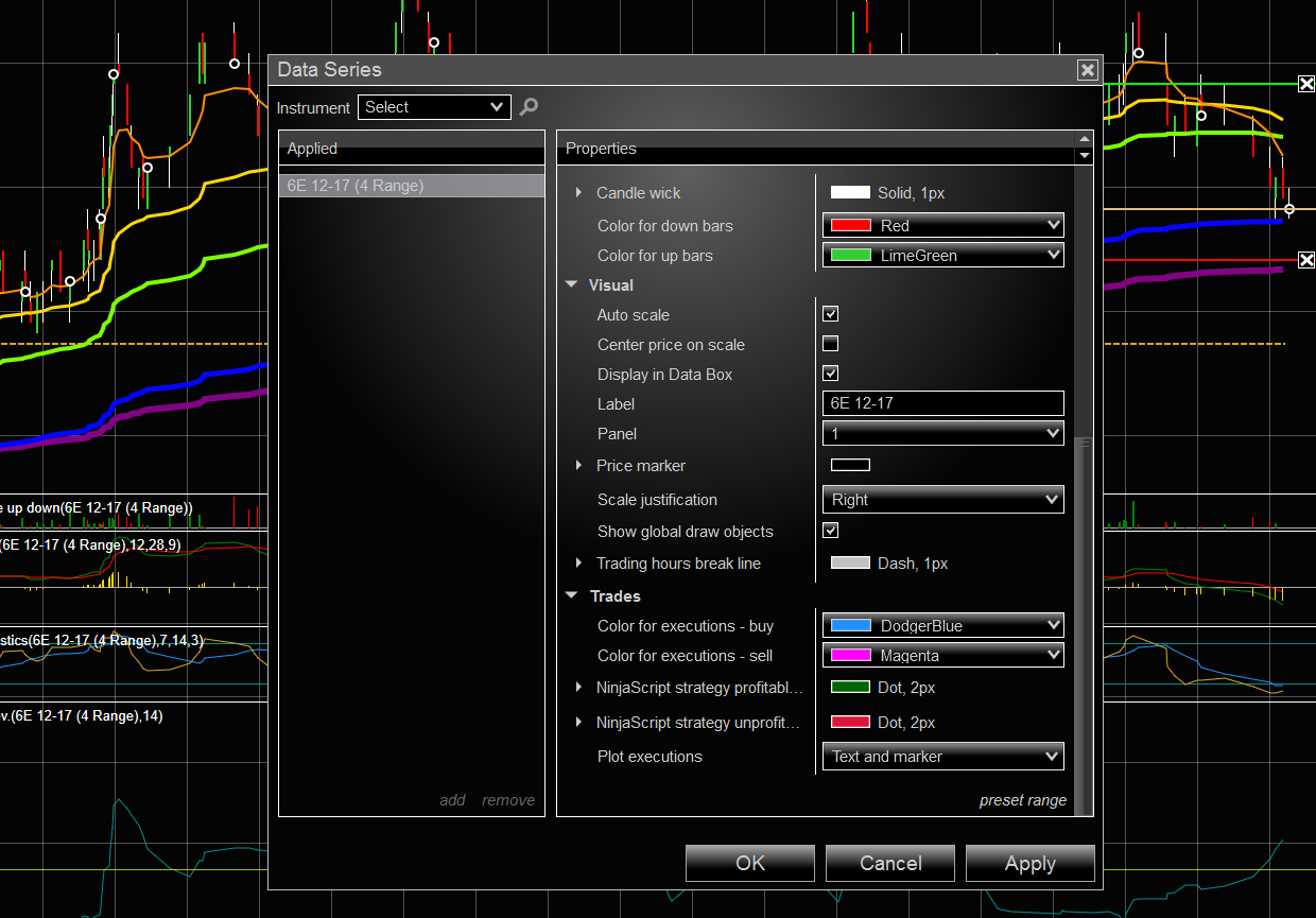 I am having a similar problem with NinjaTrader 8. I use 2 charts to trade the Japanese Yen: an anchor chart, with 12 range bars (https://ninjatrader.com/support/foru...5&d=1516897459), and a trading chart, with 4 range bars (https://ninjatrader.com/support/foru...6&d=1516897474). The trades mark on the anchor chart, but not on the trading chart. I have the markers turned on, on both charts (https://ninjatrader.com/support/foru...4&d=1516897459).