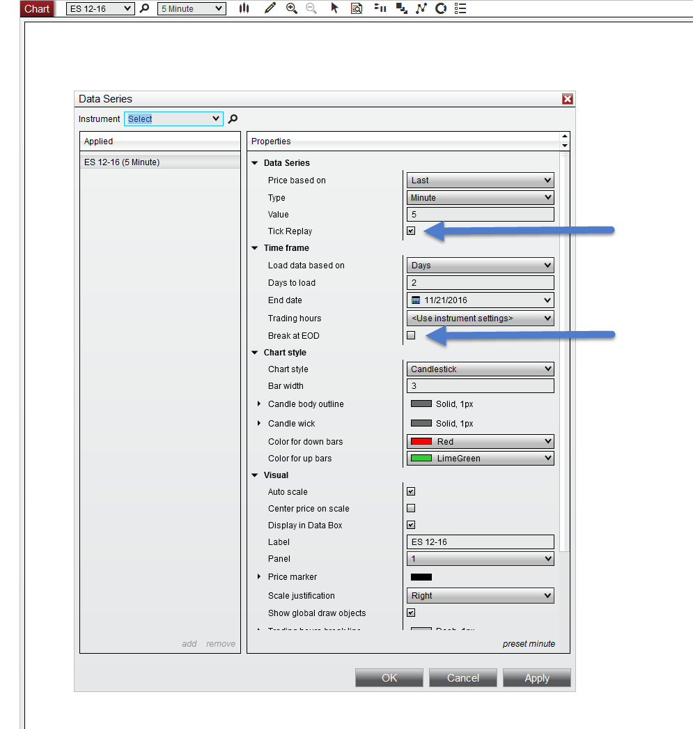 I reported an issue a few weeks ago with charts not loading any data if "Tick Replay" was checked but "Break at EOD" was unchecked.
