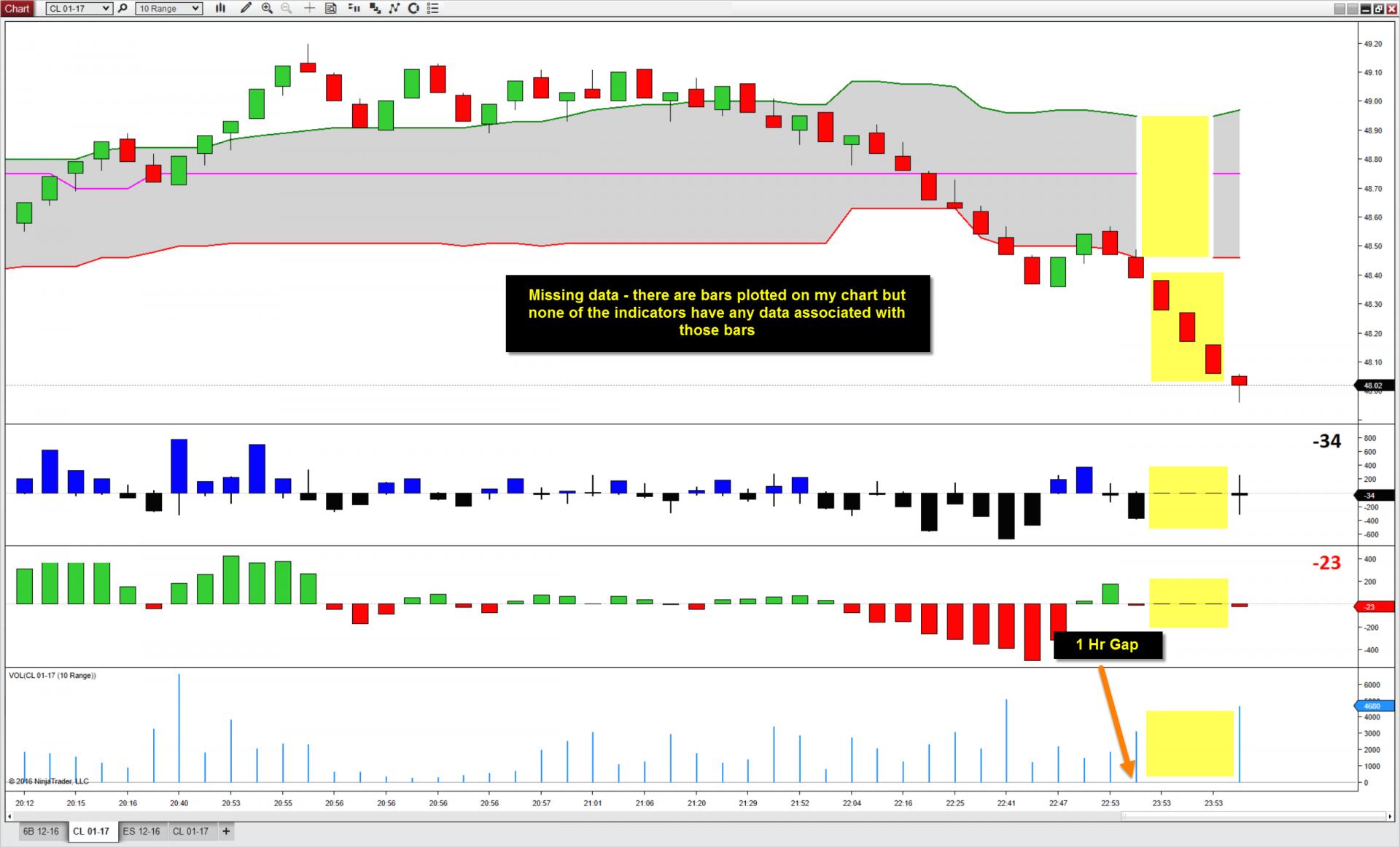 The candlestick bars appear on my chart but none of the indicators have any data associated with them. If I change the chart from a candlestick bar to a footrpint style bar, the footprint bars don't appear on the chart for the period of the bad data.