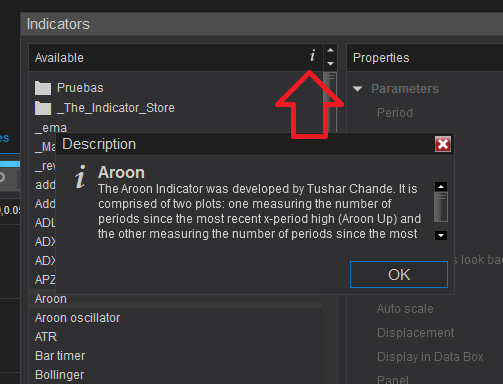 1. Select an indicator in the "Available" list and click the little i on the upper right corner of the list.