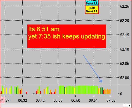 In each of your cases your chart was not positioned at the Current bar. In all my years of trading I have never seen such a discrepancy. You don't expect a projection into the future with tick bars to be accurate but this is so far off its ridiculous. It leads one to believe the time is different than it actually is. Its right AT the current price by one narrow bar and actually sometimes flashes to a value which looks much more reasonable. There is something very disturbing about this.