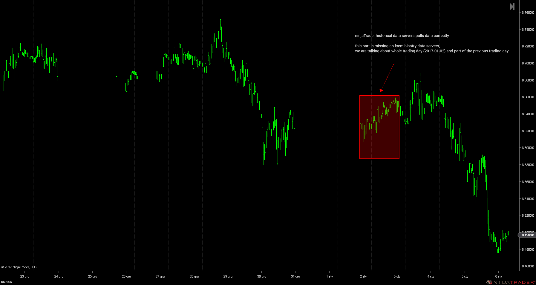 below are some screenshots, one depicts data pulled from fxcm servers and the other one shows data pulled from ninjatrader servers.