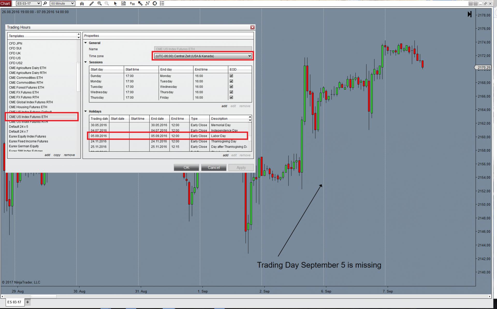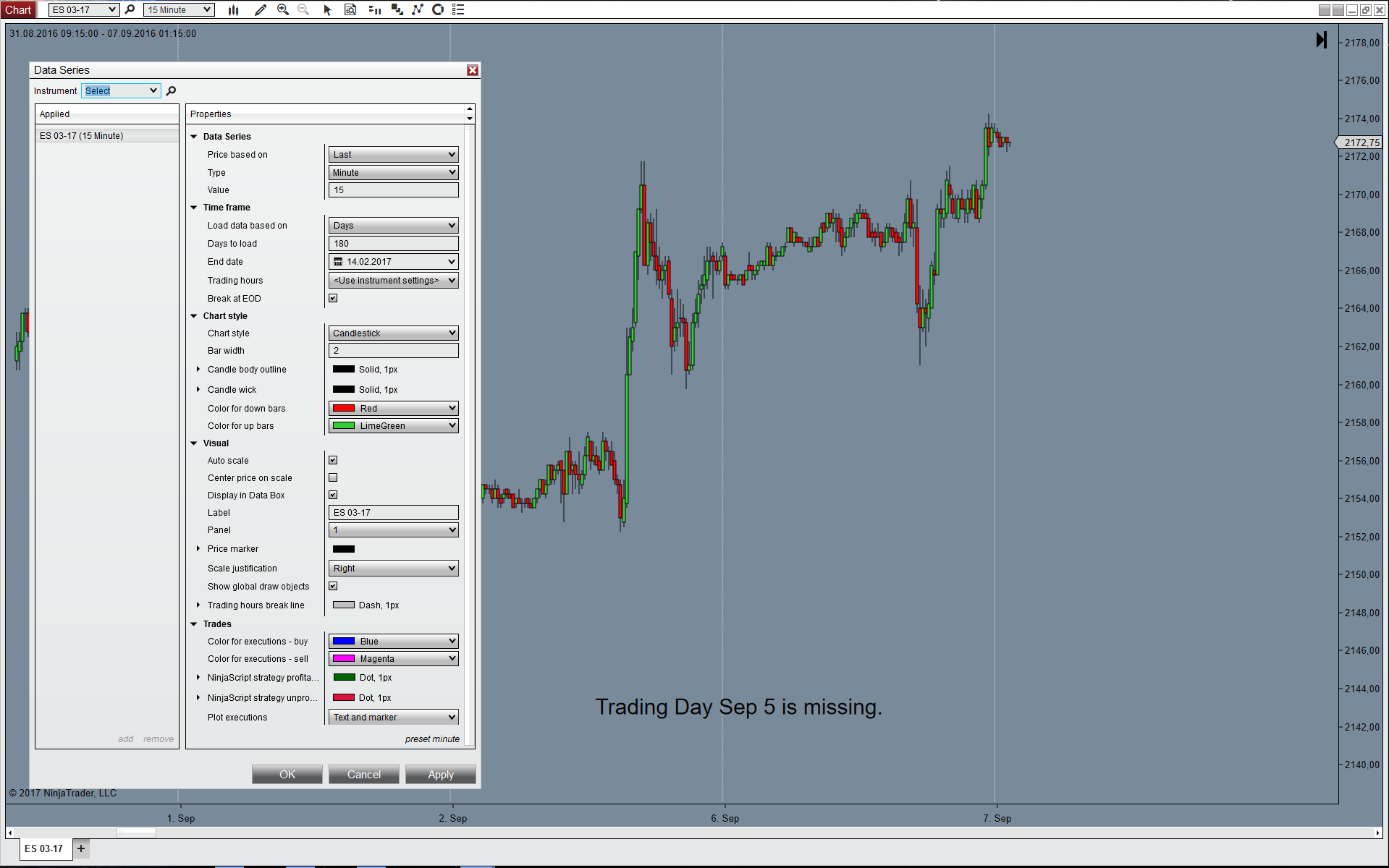 I have just opened a chart for ES 03-17 with a lot of missing data. Lucky enough this was not a technical problem but the missing data is due to the Trading Hours that come preset with NinjaTrader.