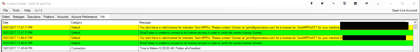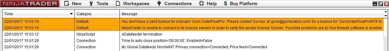 Message is "NinjaTrader is unable to connect to its license servers in order to verify the vendor license 'Gomex'."