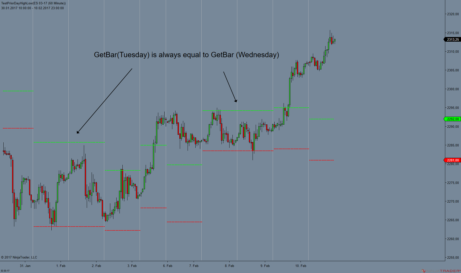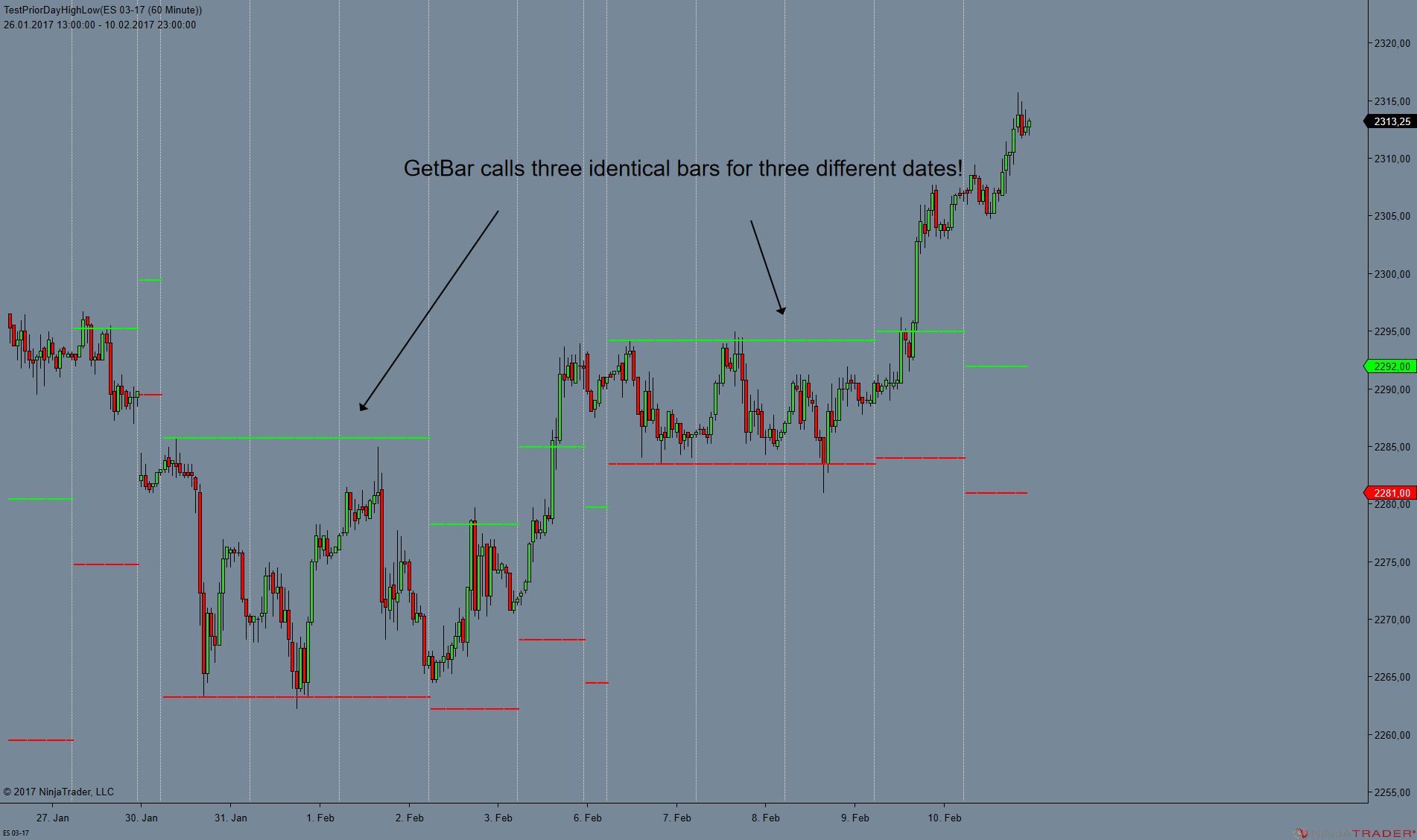 This is worse. I have applied a simple indicator to a 60 minute chart for ES 03-17 with a session template 24/5. And this is the outcome. GetBar always calls the same bar for Tuesday and Wednesday without a valid reason.