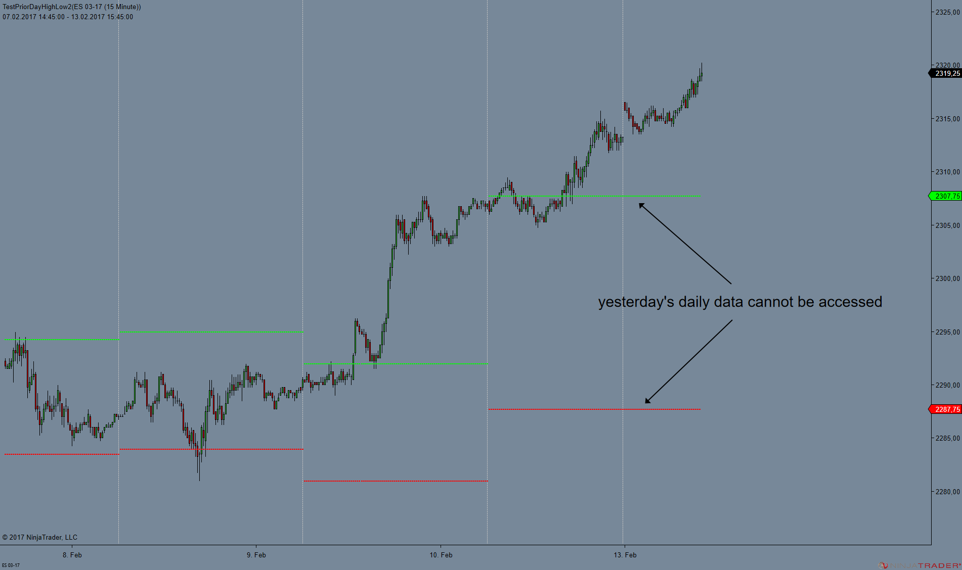 I am aware that today's daily bar cannot be accessed in Calculate.OnBarClose prior to the close of the trading day (event driven). But I am talking about yesterday's bar which is not being processed.