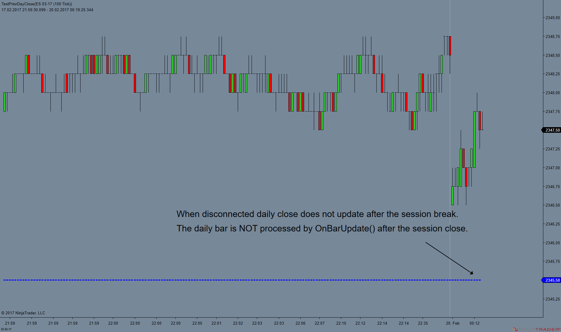 This is opposed to how NinjaTrader 7 handled a disconnected feed, in which it would only show the last bar close regardless of using CalculateOnBarClose = false.