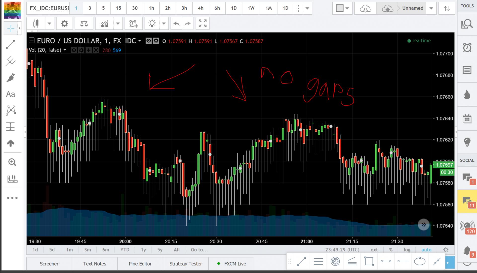 So it would be very ignorant to make the assumption that during the period on those charts, that FXCM's customers were the only people trading.... In truth we don't really know, because with no central exchange there's no way to know exactly who is trading and at what prices. But we make the assumption that someone else probably is trading somewhere in the world given the $5 Trillion in volumes, and therefore gaps do not appear on Intraday forex. It just doesn't happen. Only at the weekend, and at the 22:00GMT / 17:00EST Settlement split