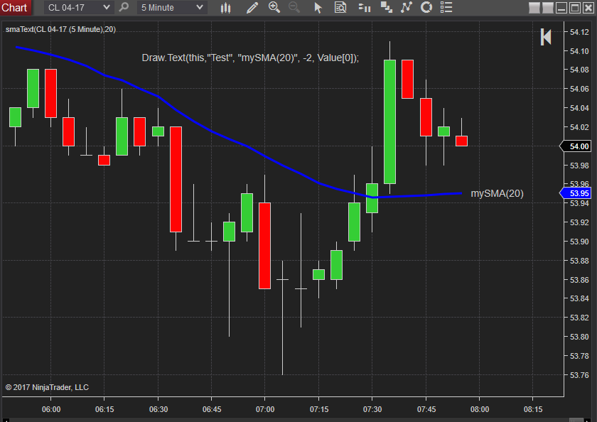 If you have plots that you want the text associated with you could also add a Draw.Text() statement for each plot and use a future bar as a location that will print the text to the right of the plot line (you will need to increase the charts right side margin to see the text). A future bar would be like -2 or any negative value. I've shown an example in the attached. The text could be colored as needed. (This was a Draw.Text() statement added to a copy of the SMA indicator so Value[0] is the Y value of the SMA indicator. I've shown the code statement on the chart as well Using this Draw.Text() method has its disadvantages as when you expand or contract the data time base the text will move just like any candle.