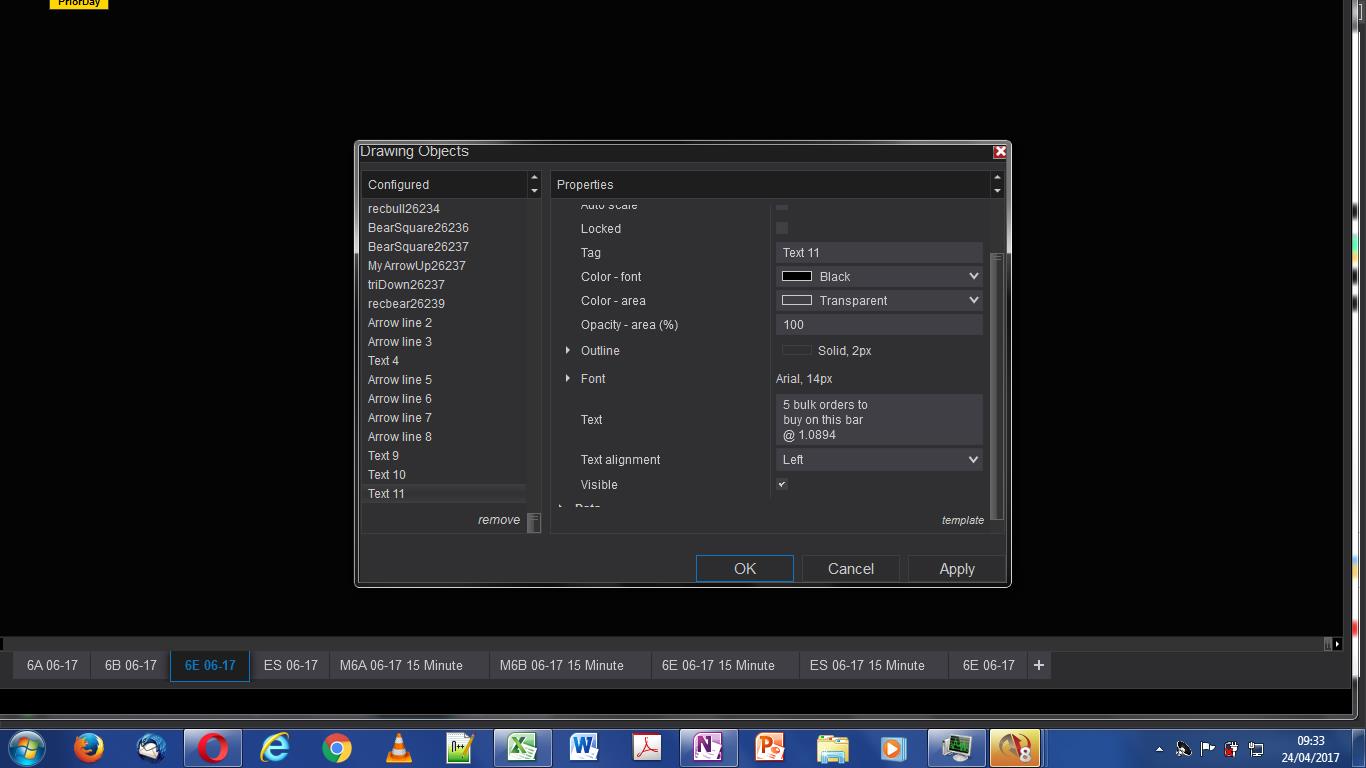 Today I used the NT Drawing Tools to write some notes to the chart. I wanted to adjust them via the properties, and again the chart went black as I accessed properties. Once I got access, I adjusted the note and pressed OK. The chart went black again, lasting for several minutes, so I had to shut down NT via Task Manager.