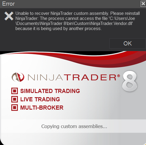 This indicates that either another program is accessing NinjaTrader's files (like a firewall, virus protection, or automatic backup program) or NinjaTrader was not fully shutdown before you attempted to restart.