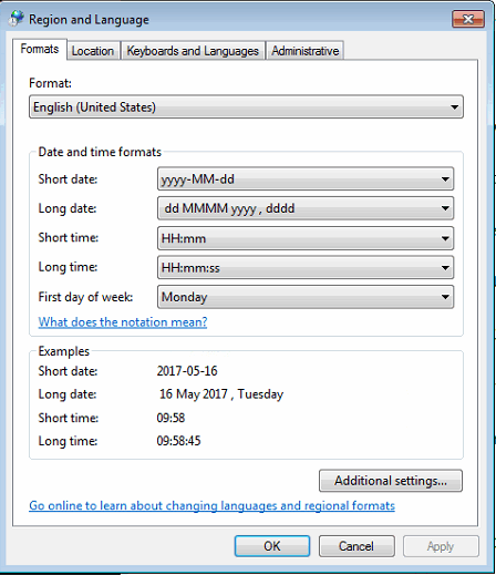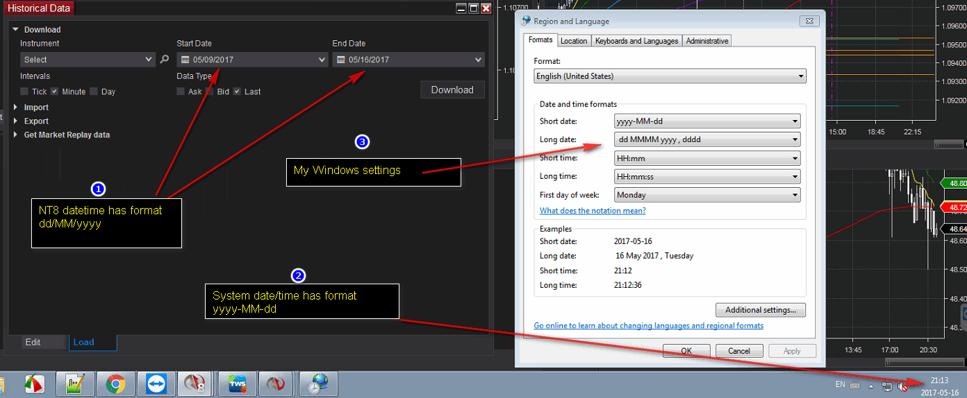 I found some Datetimes in NT8 have invalid formatting, that does not reflect locale settings in Win7.