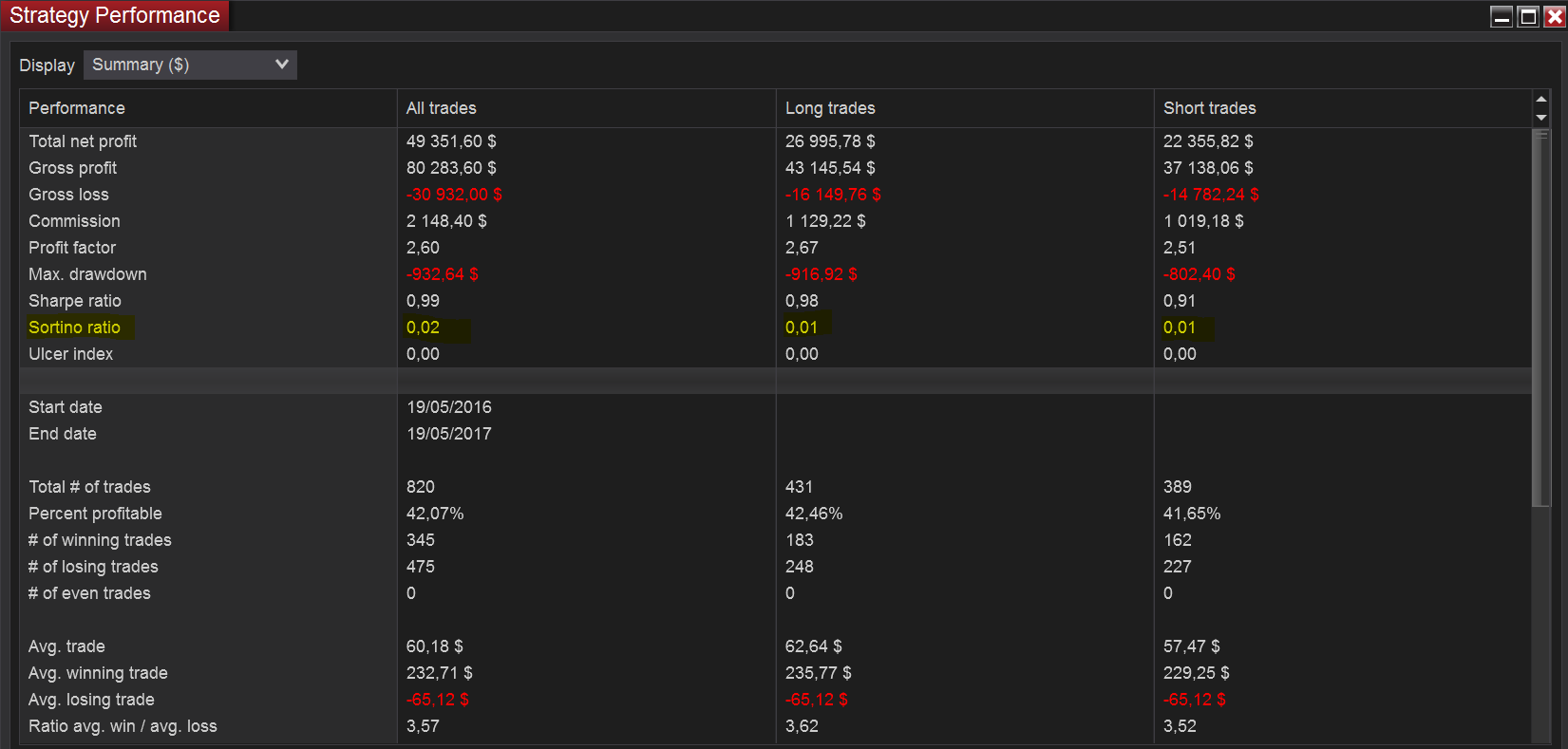 The Sortino Ratio on the Strategy Performance window is always 0 or very near, despite the Sharpe Ratio near 1, which doesn't make any sense imo. See attachment.
