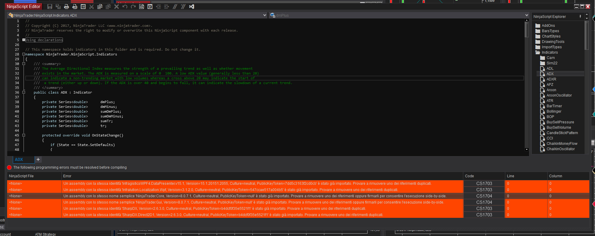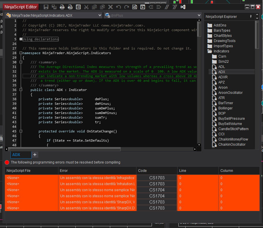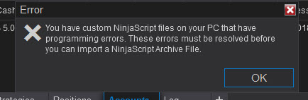 NT 8 error message i got when trying to import a ninja script (indicator ...) in Tool -> Import -> Ninjascript Add-On