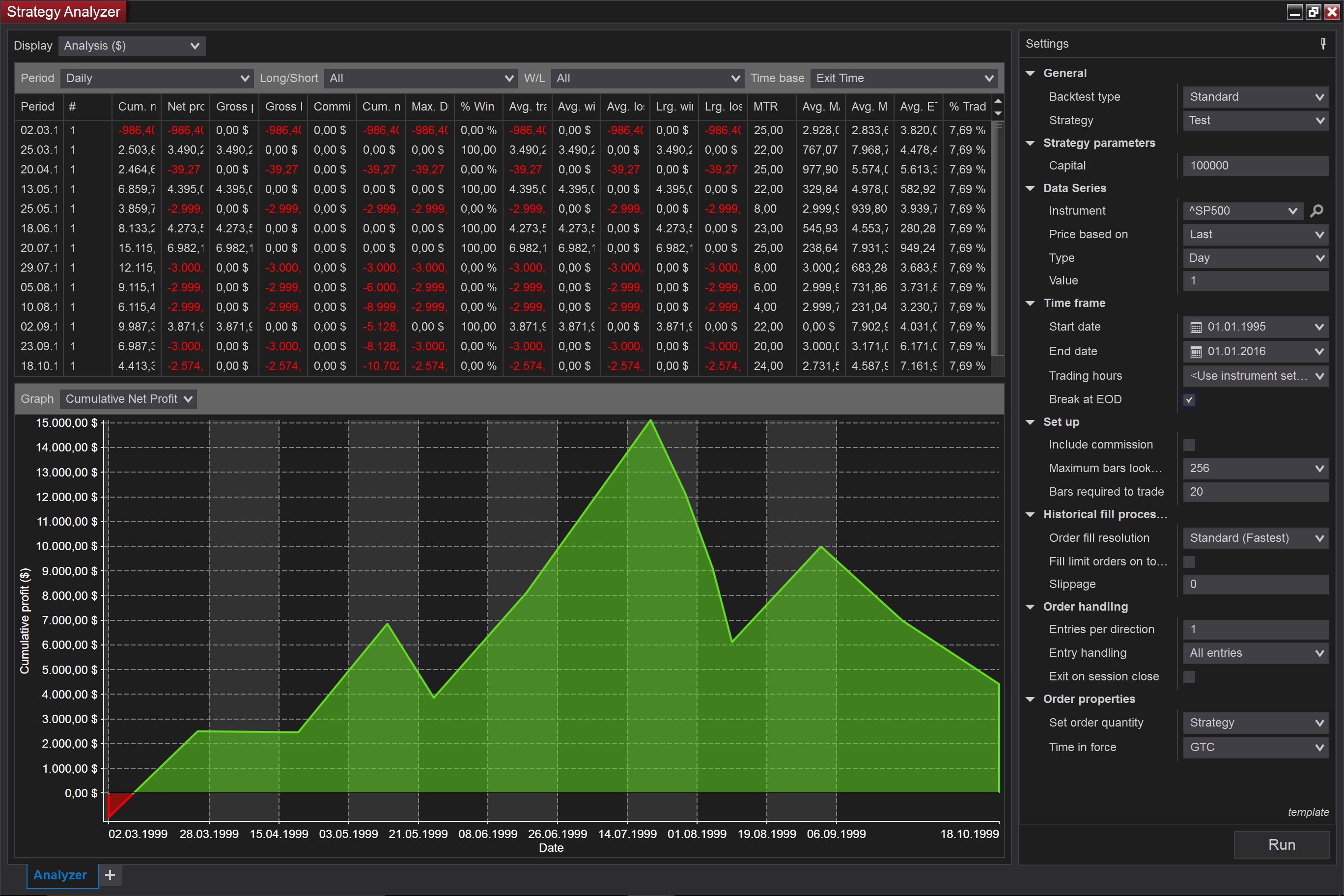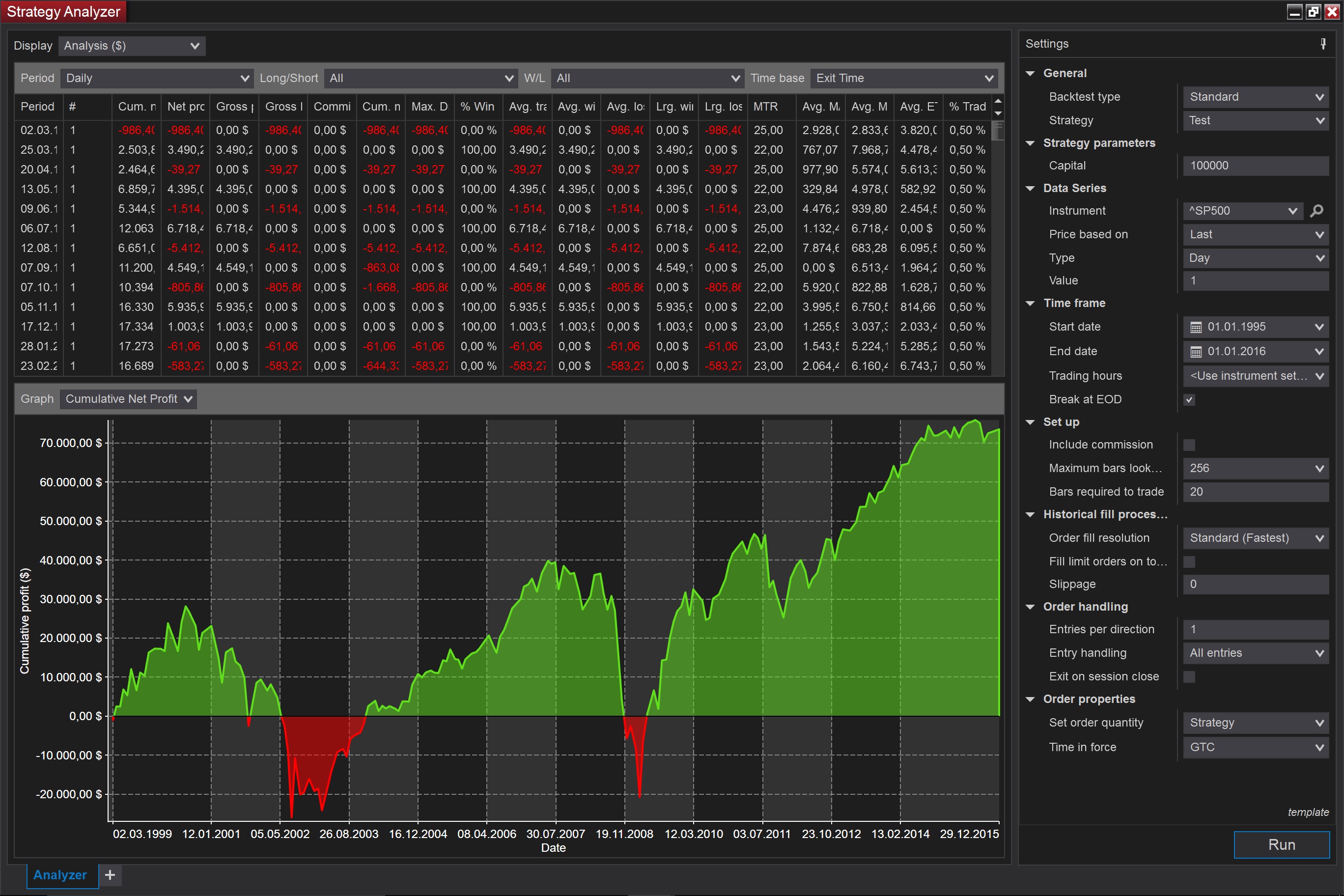 I am back testing a strategy on the S&P500 with daily bars. The timeframe is 1995-2016.