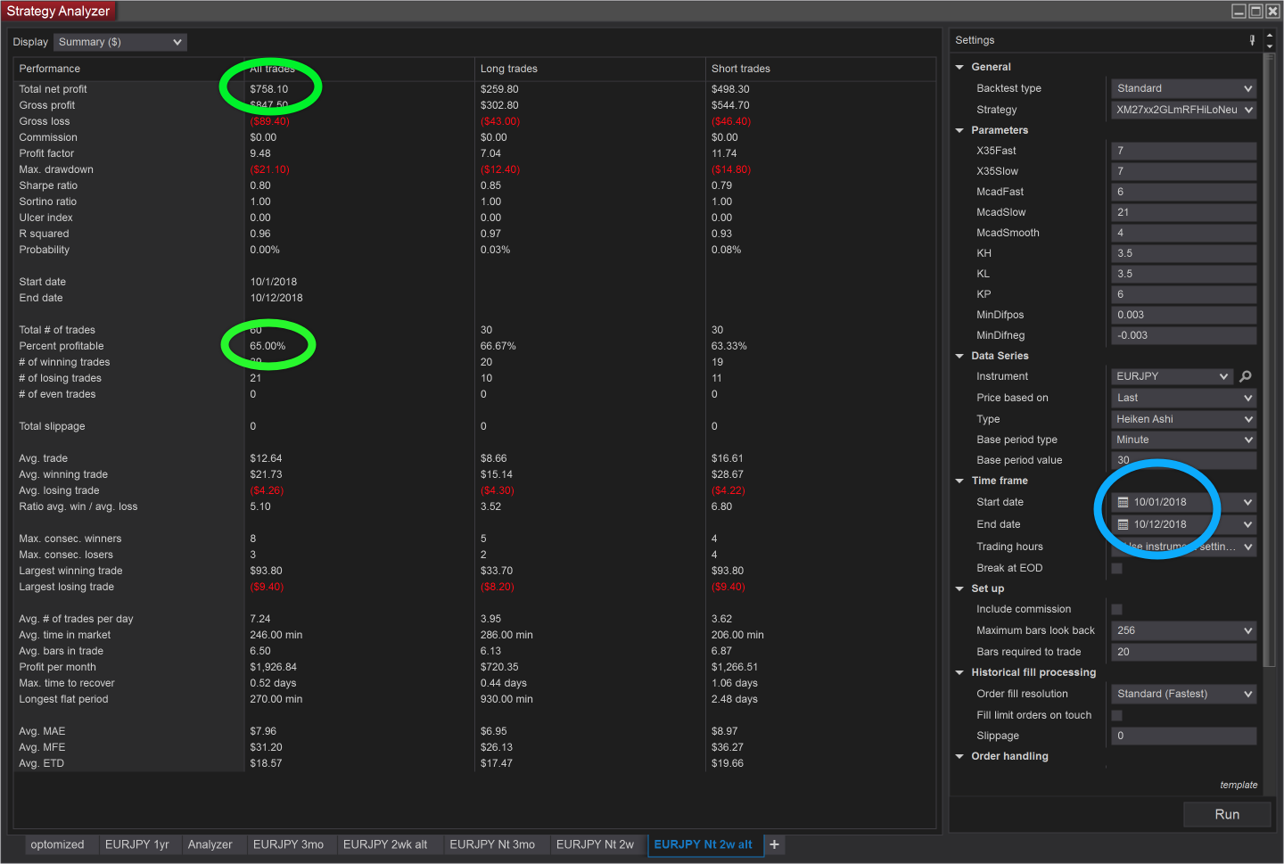 Image 03 shows the trades produced by each method. The green circles highlight the similarity of the trades taken by both strategies. The red circles highlight differences in profitability and entry/exit times. It is interesting to note how the entry/exit times are offset by 30 minutes but otherwise track together for the highlighted trades.