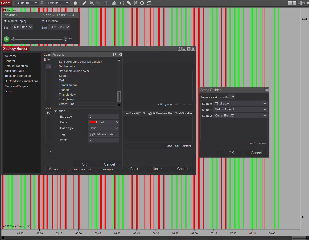 With NT7 it drawn on every single bar (backward) a vertical line when condition where given.