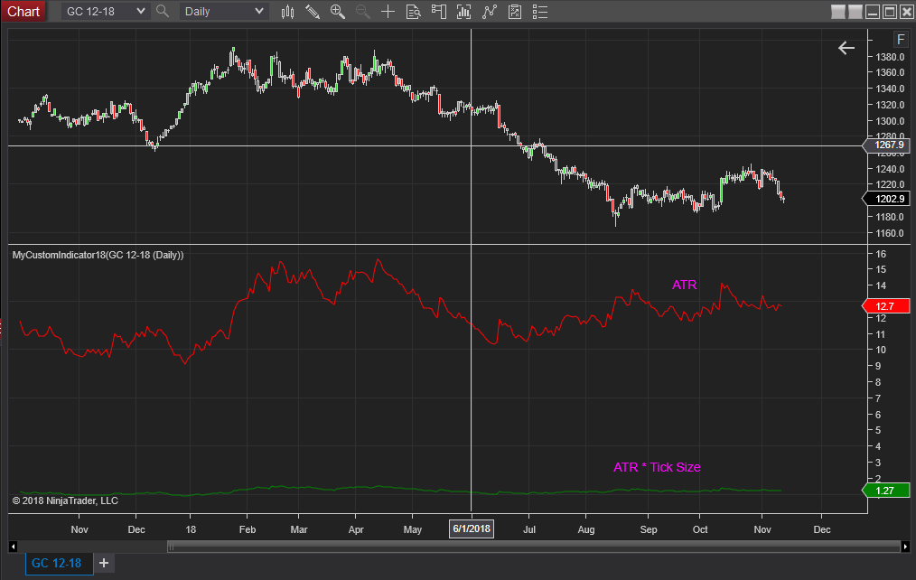 So the ATR indicator is returning the value in points and not ticks, correct? So in your example above I would simply subtract 12.7 from the current price of gold, correct? In that case no need to multiply the ATR by Tick Size. Am I right? Like in Euro for example the ATR is showing in decimals like 0.00172 which is like 17 ticks. So in Strategy Builder if I select Price it will round off the number and deduct from current price to place stop or target?