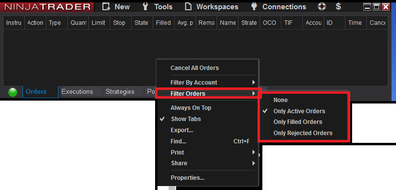 There are many orders shown in the "Orders" tab in control center as well as in strategy.Orders. I would like to view the most recent or only open orders..
