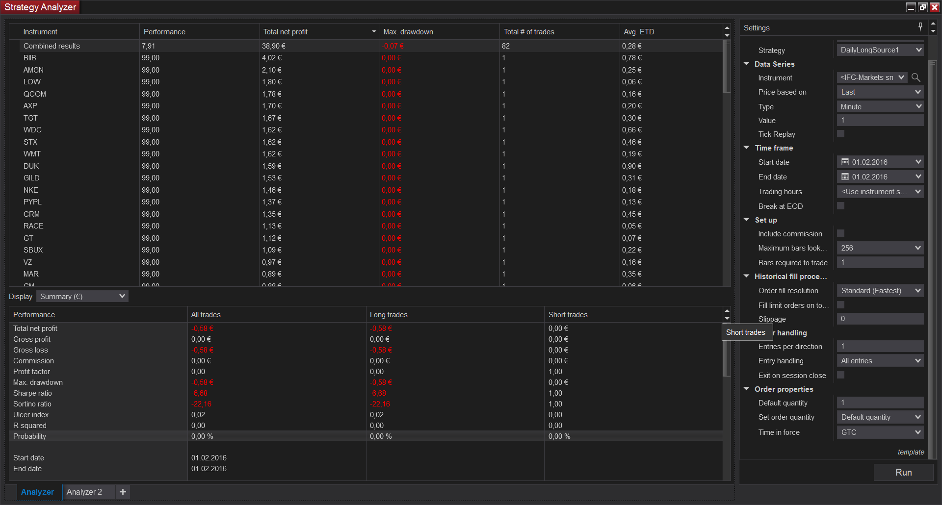 I am currently comparing several equities within one strategy. After running the strategy I get absolute value results (Gross Loss/Gross Profit/Total Net Profit) for every equity in the Display Sector of the Strategy Analyzer. To compare the equities with each other I would need to get relative values as results such as Profit/Stock Price. I tried to create a solution in the Settings panel of the Strategy Analyzer under the tab Order Properties -> Set order quantity -> Strategy, but couldn´t find something there as well to build into the strategy directly to put the result values into a relative condition regarding their stock price.