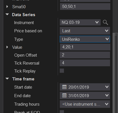 I want to optimise a strategy by Data Series using UniRenko bars. The optimisation allows varying one of the 3 parameters that define the 'time frame'.