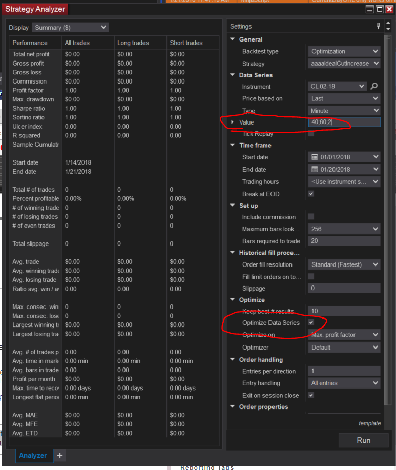 Within the analyzer, you would check Optimize Data Series, which will then allow you to pass the parameters of min, max and step for the value of the data series.