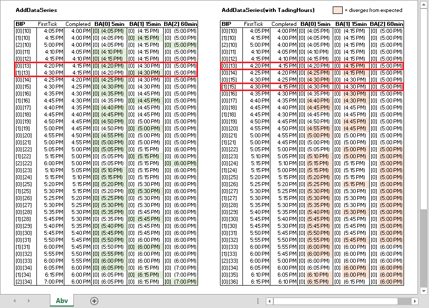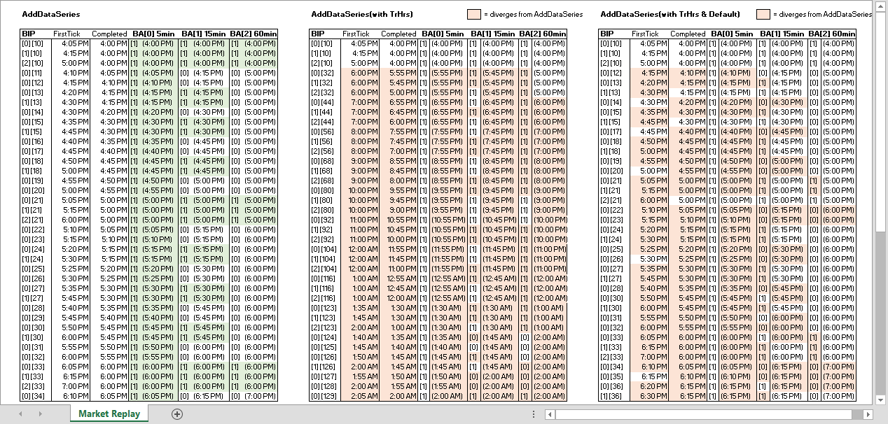 • At row BA[1][15], this is purporting to be the FirstTick of the 15min bar ended 4:30pm (e.g. 4:15:01pm). However, as shown by the preceding rows BA[0][14] & BA[0][15], the 5min bars ended 4:20pm & 4:25pm have concluded (e.g. at 4:20:01pm & 4:25:01pm respectively). It is as though the FirstTick of BA[1] is just under 15mins late.