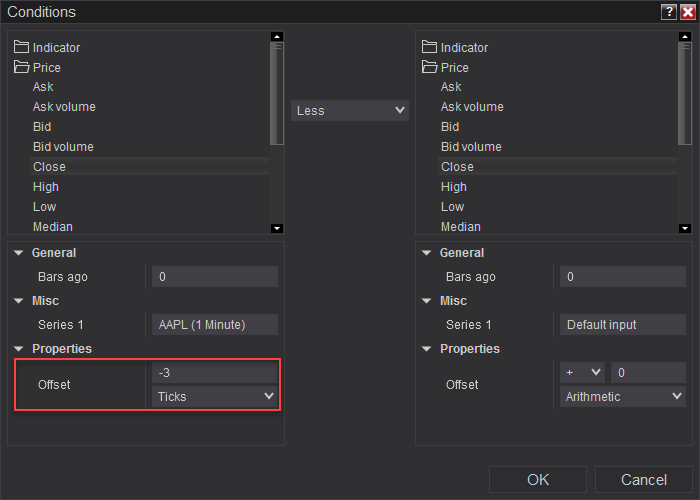 Attached is a screenshot of the offset for a low price of a secondary series that subtracts 3 ticks.