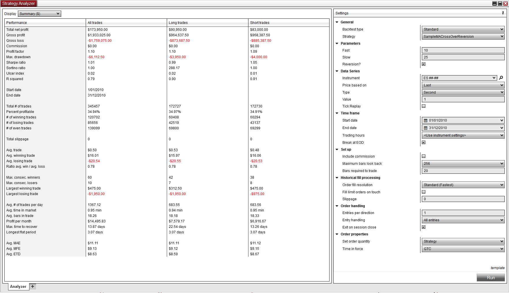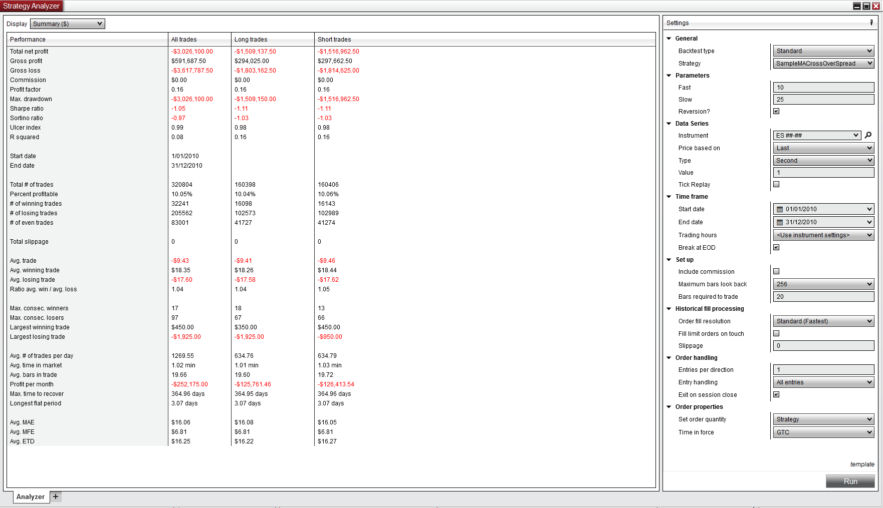 "SampleMACrossOverSpread.cs" does generate huge losses (greater than $3M) due enforcing that shorts get filled on the next downtick (which means it is at the BID since we are using Trade/last Tick data) and longs get filled on the next uptick (which means it is the ASK).