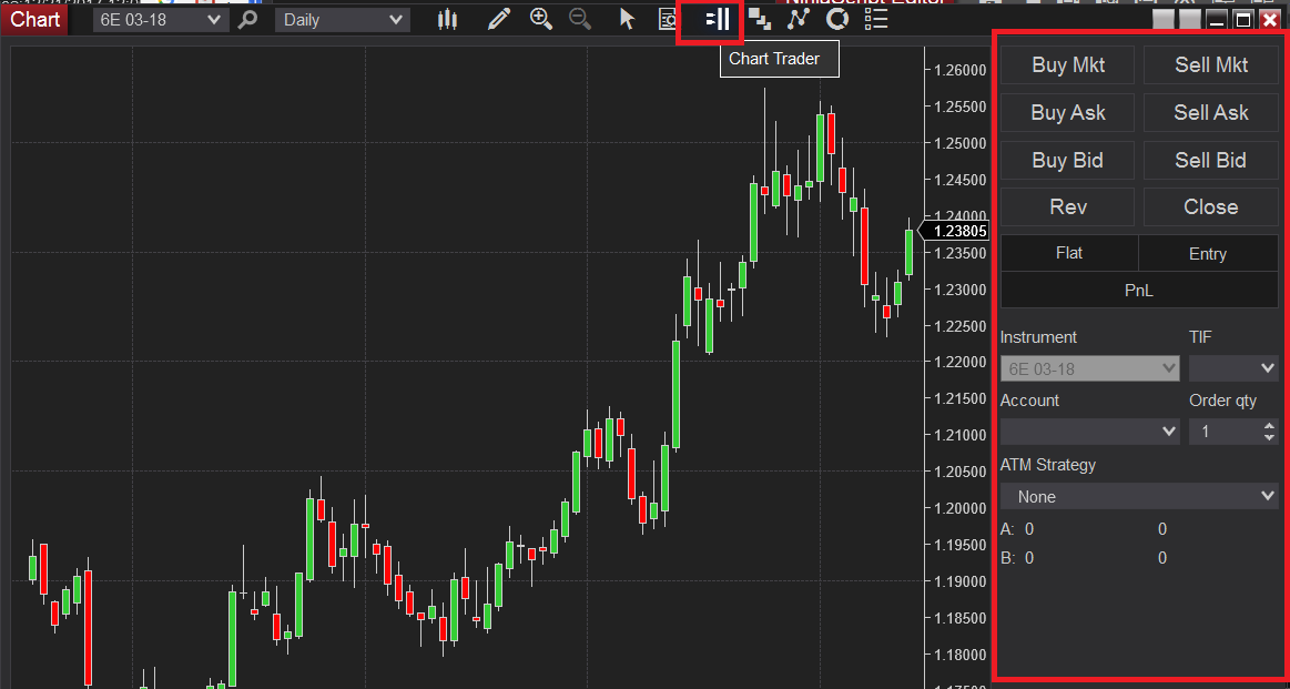 With a strategies applied, you should click the Chart Trader symbol, which will open chart trader. (See screen shot).