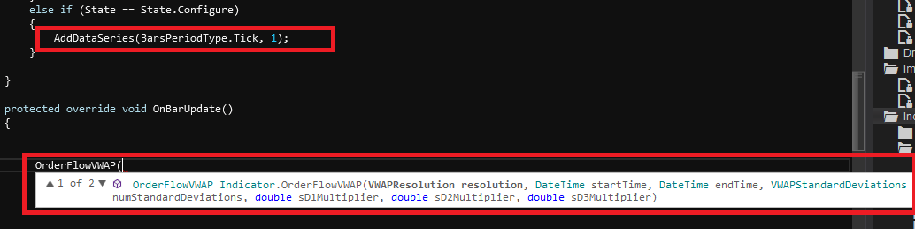 2. You can use the example code in strategies they provide but... if you use visual studio you must add CustomerVendor.scott to your project for visual studio to compile (and updates or compiling again in NinjaTrader will remove this and you have to add it back). I also have to check but performance was much lower for my strategy when adding that order flow VWAP ninjascript... the other disadvantage you get with this option is it doesn’t plot on the chart itself if you’re using that feature in strategy analyzer and want the visual.