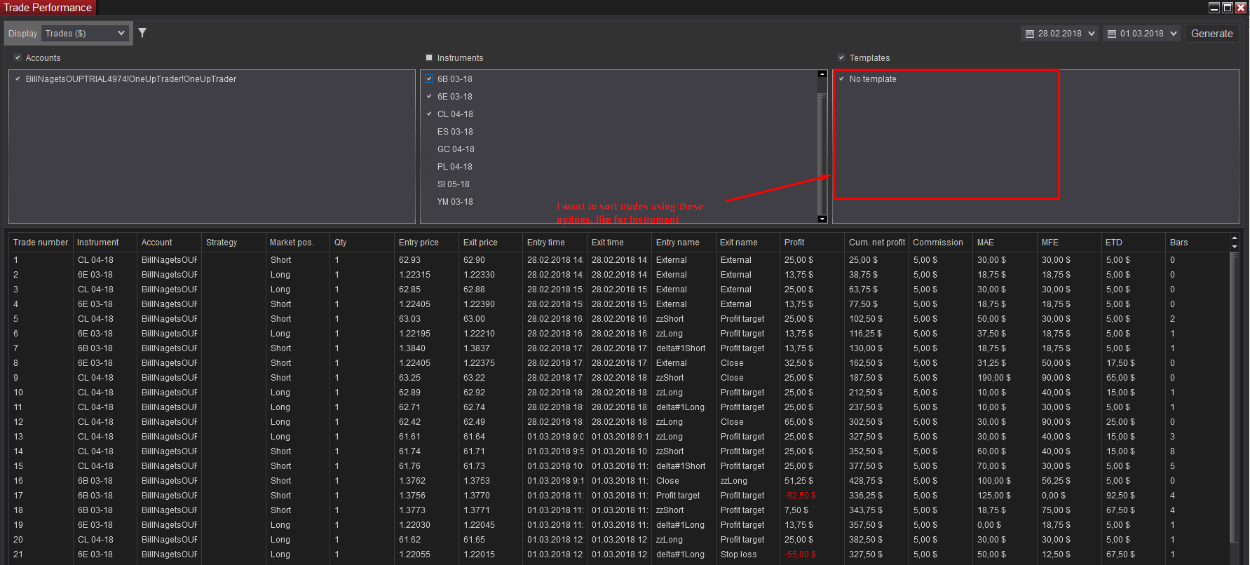 I want to be able se all trades by one entry name, for example, only zzShort for all instruments.