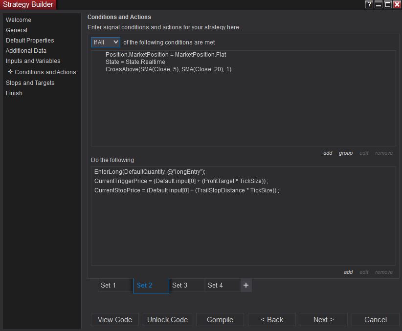 Through Strategy Builder I am able to create 4 Market orders with 3 separate Targets and 4 trailing stops... Currently, the trail is set to shift N ticks at Bar close.