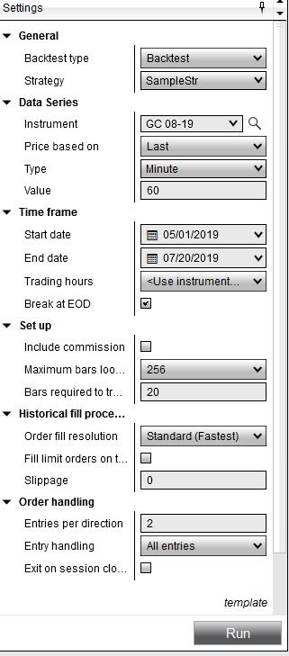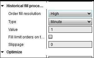 I choose Historical fill as High and Type as Minute (please see attached screen shot). The strategy trades off 1 hour bars, and submits a stop limit order to go long, for example, 10 ticks above current bar high. So if next bar hits this level the order gets executed and if not, my logic would cancel it on the following bar.