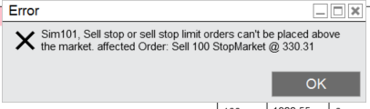 The price enters at 308.65 (on the close price of today's 5 minute NFLX bar to test). A few seconds after entry the strategy is disabled because a stop cannot be placed above the market. Sell 100 StopMarket @ 330.31.