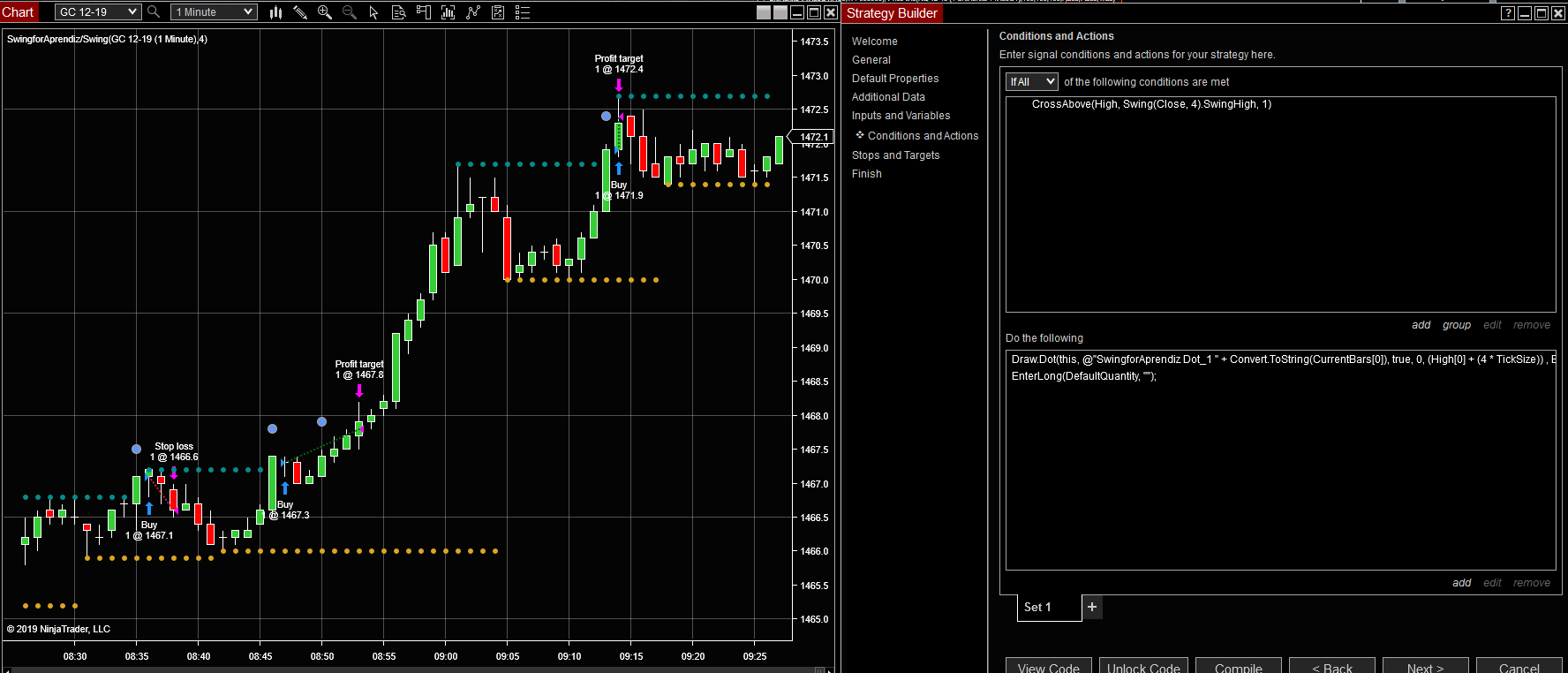 Here is a continuation of the previous example where a buy market order is placed when the High crosses the swing high, it draws a dot on the bar where the condition is true and the order is filled on the next bar (this is using Calculate.OnBarClose and market orders can only be filled on the next bar in that mode). The stops and targets are 5 ticks (not shown) in the screenshot.