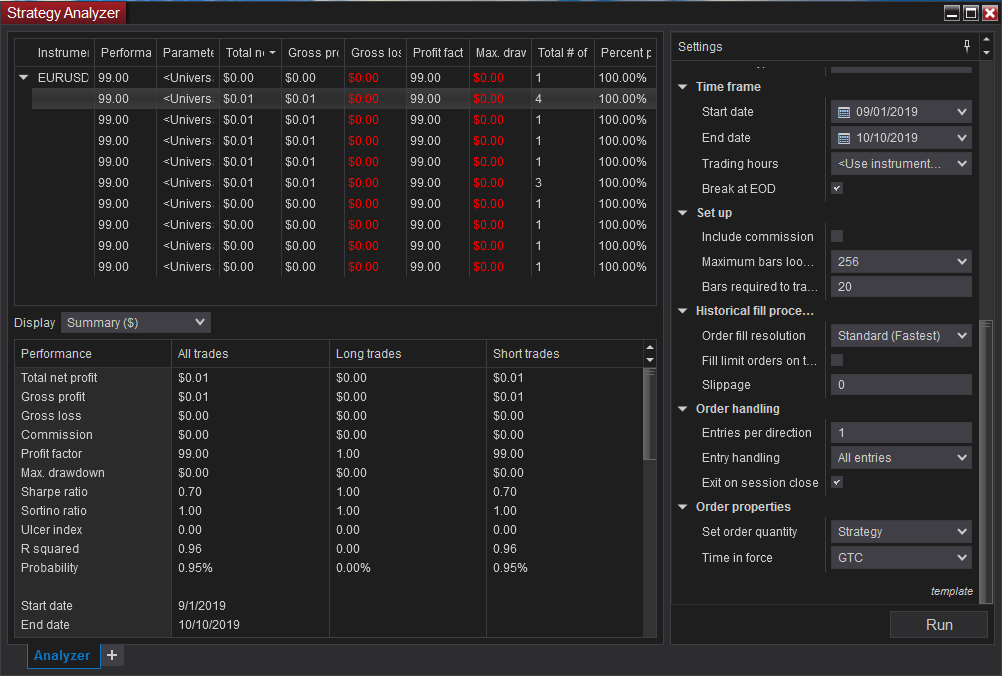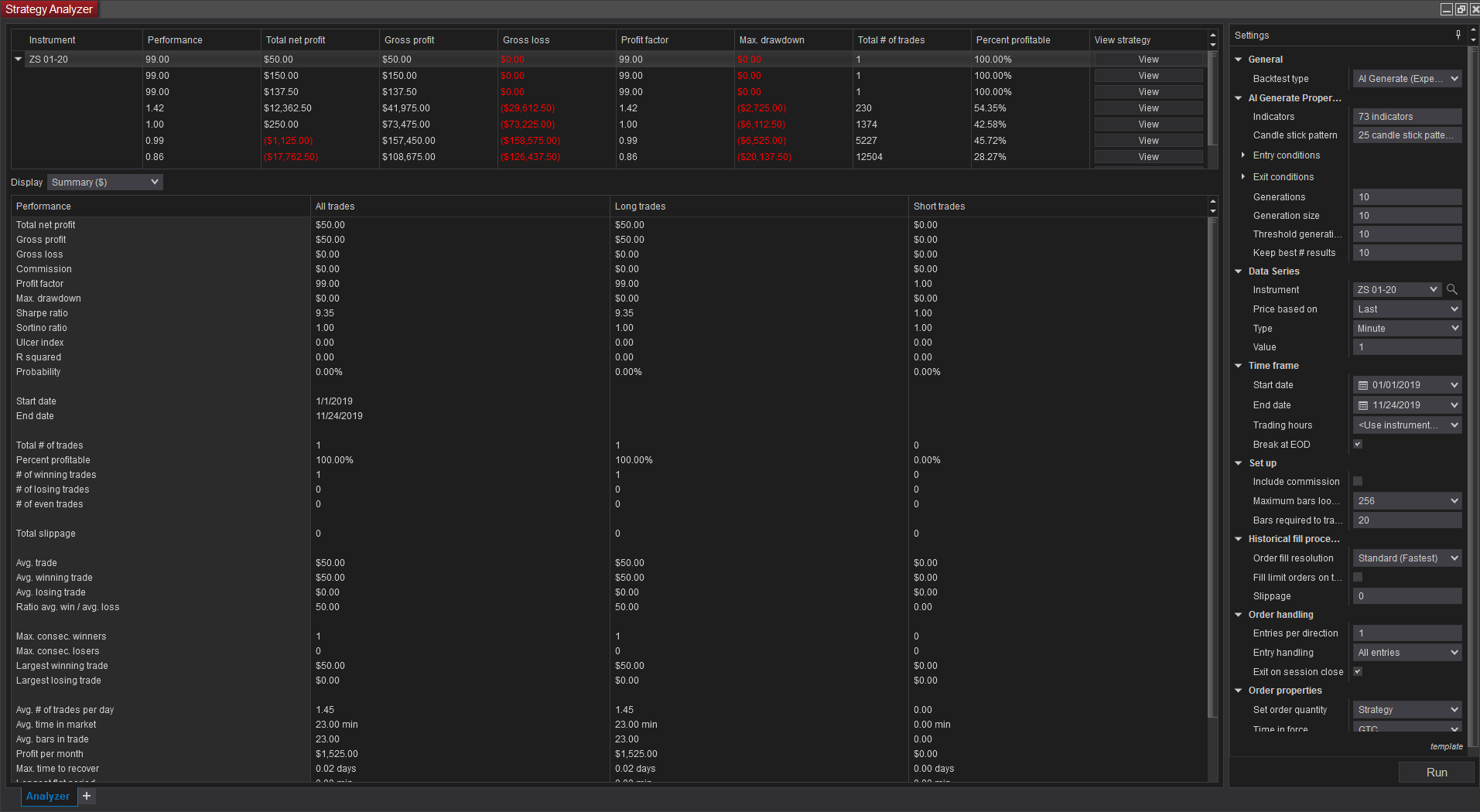 I just tried a test using the ZS 01-20 1 minute on 1 year of data and got some results. I limited the test to 10,10,10,10 for the general configuration to shorten the time it took. I did get some 1 trades but also got some other tests where more trades happened: