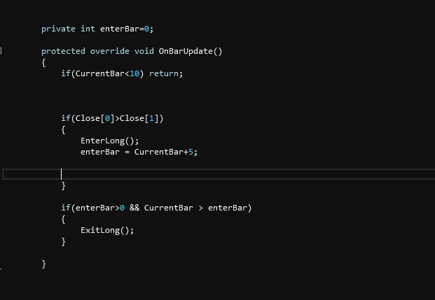 BarsSinceEntryExecution()?Originally posted by stewarco View PostHello. I'm currently working in Unmanaged framework. Based on various signals, the strategy generates buys or sells, and each order effectively has a stop and profit target associated with it. However, I would like to add a condition such that if after a given amount of time the stop or profit target hasn't been hit, then I close that particular trade. For example,suppose I buy one unit. If after 24 periods the stop or profit target hasn't been reached, then I would like to sell that unit. Does anyone have any examples of this?