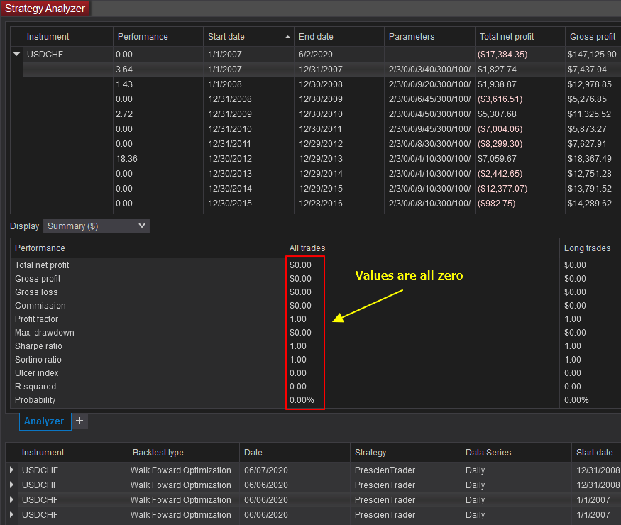 As I understand it, the walk-forward optimization results show the total of all the optimized out of sample results in the top line. And then the subsequent lines below just show which iteration performed best according to your metrics.