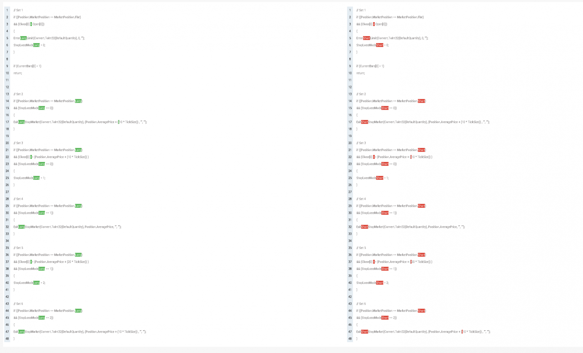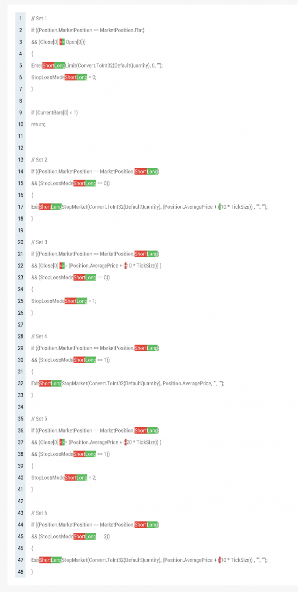 [LIST=1][*][B]// SHORT ORDERS (Sets #5 to #8)[/B][*]// Set 5[*]if (Position.MarketPosition == MarketPosition.Flat)[*]{[*]CurrentStopPrice[B]Short[/B] = 0;[*]}[*]if (CurrentBars[0] < 1)[*]return;[*]// Set 6[*]if ((Position.MarketPosition == MarketPosition.Flat)[*]&& (State == State.Realtime)[*][B]&& (Low[0] < Low[1])[/B])[*]{[*]EnterShort(Convert.ToInt32(DefaultQuantity), @"shortEntry");[*]CurrentTriggerPrice[B]Short[/B] = (Close[0] - (TrailFrequency * TickSize)) ;[*]CurrentStopPrice[B]Short[/B] = (Close[0] - (TrailStopDistance * TickSize)) ;[*]}[*]// Set 7[*]if ((Position.MarketPosition == MarketPosition.Long)[*]&& (Close[0] > CurrentTriggerPrice[B]Short[/B]))[*]{[*]CurrentTriggerPrice[B]Short[/B] = (Close[0] - (TrailFrequency * TickSize)) ;[*]CurrentStopPrice[B]Short[/B] = (Close[0] - (TrailStopDistance * TickSize)) ;[*]}[*]// Set 8[*]if (CurrentStopPrice[B]Short[/B] != 0)[*]{[*]ExitShortStopMarket(Convert.ToInt32(DefaultQuantity), CurrentStopPrice[B]Short[/B], @"", "");[*]}[/LIST]