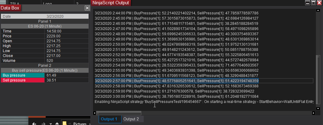 Attached is the test script and a screenshot of the output on my end compared with the DataBox from the chart with the mouse over that particular bar.Chelsea B.NinjaTrader Customer Service