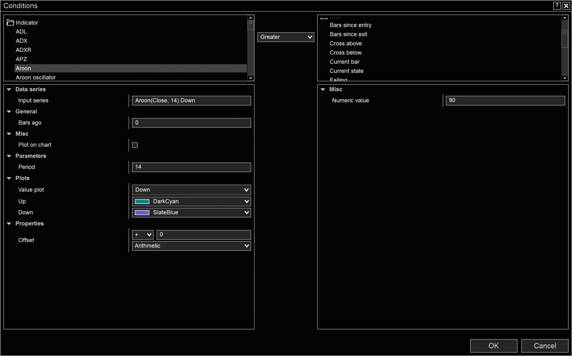 For the indicators, I have no problem with a situation where I call out for example, a SMA50 crossing over a SMA200. But when I attempt to set a condition whereas the indicator line I am measuring crosses a certain numerical value, I get errors in my code. My setting is attached.