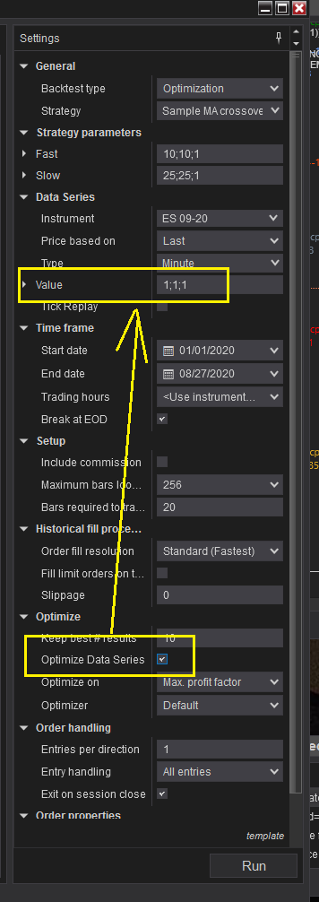 For Optimization, I would like to test different bar types, sizes and time frames. Do I need to set these up in the 'Default Properties', 'Additional Data', 'Inputs and Variables' or a combination of all 3?