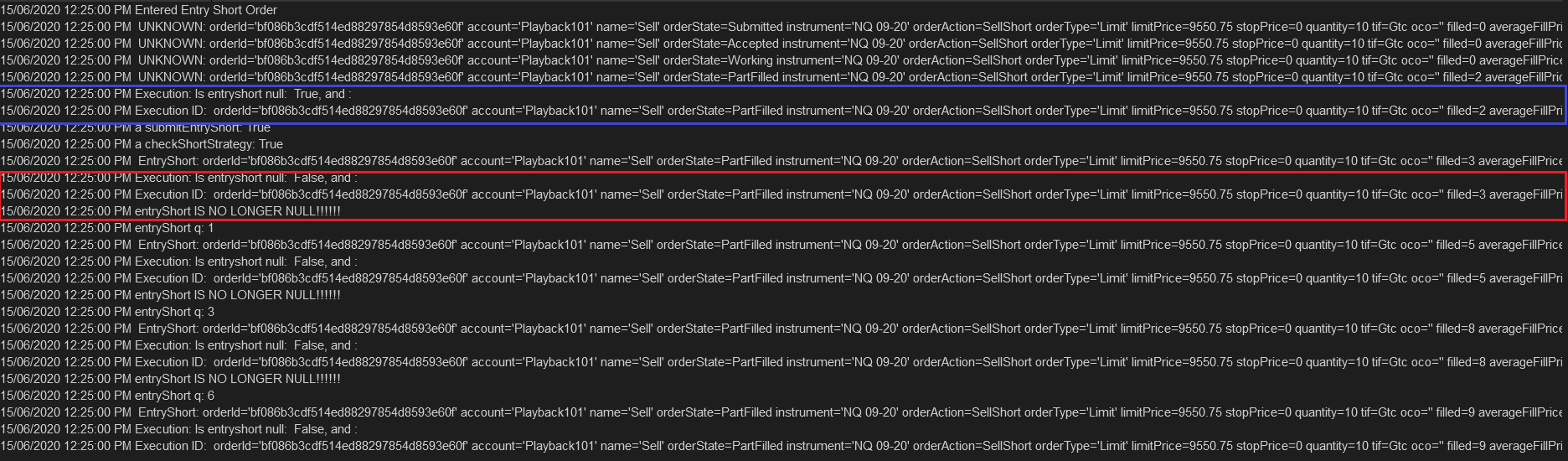 3. entryShort == null turns false after the first execution (which is a PartFill) - red border