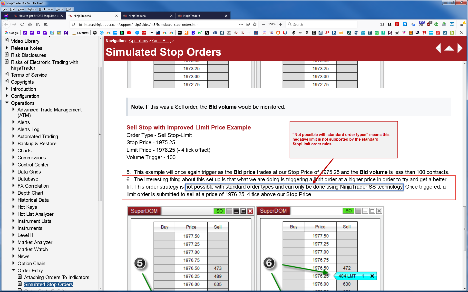 A simulated stop order, such as the one that can be placed with Chart Trader or the SuperDOM (or with SetStopLoss()), uses logic to submit the order when the price is touched instead of submitting the order immediately.